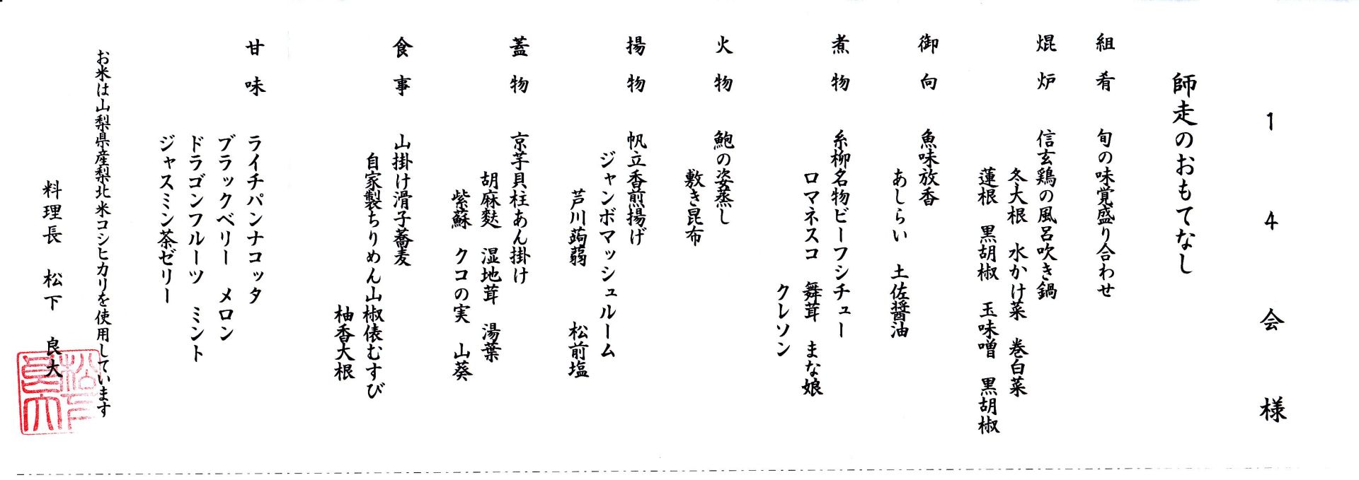 日時 平成26年(2014年)12月23日(火)〜24日(水) 開宴時間:午後6時30分から 場所 石和温泉「名湯館 糸柳」(笛吹市石和町駅前13-8) 今回のメニュー 【クリックすると大きく見られます】 御向(向附orお造りor刺身)が出てくる前のお膳 記念写真(ハシさん提供) 【クリックすると大きく見られます】